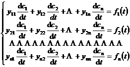 where a ik ( t ) and f i ( t )    ( ) are both known continuous functions of the independent variable t . If at least one f i ( t ) is not equal to zero, then (1) is called an inhomogeneous linear differential System of equations . If all f i ( t ) are equal to zero, then (1) is called a system of homogeneous linear differential equations, and its general form is