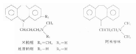 常用抗抑郁药为三环类,包括米帕明(imipramine)、地昔帕明(desipramine)阿米替林(amitriptyline)、多塞平(doxepin)等。它们与吩噻嗪类在化学结构上的主要区别是用-CH2-CH2-代替S。