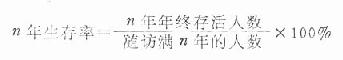 公式(23.1)例23.1某口腔医院在1981年年末总结1968~1980年口腔癌手术后随访各年存活人数,H统计出13年的生存率动态如表23-1。 表23-1 372例口腔肿瘤手术后随访活存情况统计 | 术后年数(n) | 1 | 2 | 3 | 4 | 5 | 6 | 7 | 8 | 9 | 10 | 11 | 12 | 13 |  | 存活人数 | 339 | 260 | 191 | 165 | 147 | 116 | 95 | 80 | 57 | 33 | 19 | 11 | 4 |  | 随访满n年人数 | 372 | 344 | 288 | 265 | 244 | 206 | 176 | 143 | 109 | 66 | 44 | 23 | 5 |  | 生存率(%) | 91.13 | 75.58 | 66.32 | 62.26 | 60.25 | 56.31 | 53.98 | 55.94 | 52.29 | 50.00 | 43.18 | 47.83 | 80.00 |  |   |   |   |   |   |   |   |   | < |   |   |   | < | < |