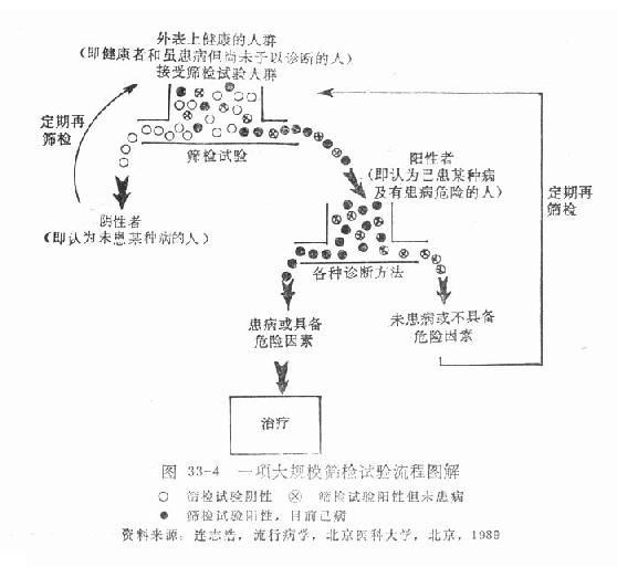 筛检是运用快速和简便的检查、检验和手段自健康人群中发现早期病例的工作。它是一种初步检查,不是对所患疾病作出诊断。筛检阳性干尚须就医,以便作出确切的诊断和接受必要的治疗。现以图解来说明,见图33-4。经过筛检,将健康人分为两部分,一部分为筛检阴性,认为是健康人群,按照筛检计划,以后按期再参加筛检。另一部分为筛检阳性,认为他们是某病的早期病例,他们经过各种诊断试验检查后,又分为两部分,一部分为确定现时未患某病,但以后也应按期参加筛检。另一部分则确诊已患某病,应接受治疗。