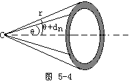 式中Z是原子核的电荷数(原子序数)。dn表示单位时间内散射角在已知值θ与θ+dθ之间的粒子数目。换句话说dn是单位时间内在开放角为2θ和2(θ+dθ)的二锥体之间的空间内飞行的a粒子数目。如果我们以这两个锥体的顶点c为球心,作一半径为r的球,则这两个锥体在球面上截出的面积为2πrsinθ·rdθ=2πr2sinθ· dθ的区域,如图 5-4所示的阴影部分。所有dn个粒子都射在这区域的面积上。因而落在单位面积上的粒子数目