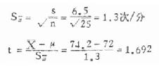 从式中可知,t是样本均数与总体均数之差(以标准误为单位),t的绝对值越大也即X距μ越远。在t分布中距μ越远的样本均数分布得越少(所占百分比小,P值小),后面附表3右上角的示意图中展示了这种关系,如欲知各自由度下t值与其相应的P值可查附表3。 下面回答本例提出的问题而进行假设检验。按一般步骤: (1)提出检验假设H0与备择假设H1。本例H0为某山区成年男子的脉搏均数与一般成年男子的相等,μ=μ0=72次/分;H1为两者不相等μ≠μ0,即μ大于或小于μ0(这是双侧检验,如果事先已肯定山区人的脉搏不可能低于一般人,只检验它是否高于一般人,则应用单侧检验,H1必为μ>μ)。 (2)定显著性水准α,并查出临界t值。α是:若检验假设为真但被错误地拒绝的概率。现令α=0.05,本例自由度ν=n-1=25-1=24、查附表3得t0.05,24=2.064。若从观察资料中求出的∣t∣值小于此数,我们就接受H0;若等于或大于此值则在α=0.05水准处拒绝H0而接受H1。 (3)求样本均数X、标准差S及标准误Sχ并进而算出检验统计量t。现已知X=74.2次/分,S=6.5次/分,只要求出Sχ及t值即可。