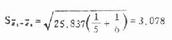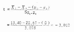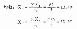 (3)求统计量 已知X1=55.1,X2=95.5,至于求t值时作为分母的标准误,在暂缺原始数据时由已知的两个标准差先推算出合并方差Sc2进而求出Sχ1-χ2即可,方法如下;