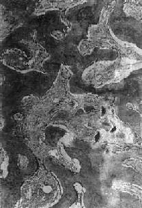 图17-2 骨痂 在幼稚编织骨骨小梁表面的骨母细胞排列成行 按照骨痂的细胞来源及骨痂的部位不同,可将骨痂分为外骨痂和内骨痂。 1.外骨痂(external callus)或骨外膜骨痂(periosteal callus),是由骨外膜的内层即成骨层细胞增生,形成梭形套状,包绕骨折断端。如上所述,以后这些细胞主要分化为骨母细胞形成骨性骨痂,但也可分化为软骨母细胞,形成软骨性骨痂。在长骨骨折时以外骨痂形成为主。 2.内骨痂(internal callus)由骨内膜细胞及骨髓未分化间叶细胞演变成为骨母细胞,形成编织骨。内骨痂内也可有软骨形成,但数量比外骨痂为少。 (四)骨痂改建或再塑 上述骨痂建成后,骨折的断端仅被幼稚的、排列不规则的编织骨连接起来。为了符合人体生理要求而具有更牢固的结构和功能,编织骨进一步改建成为成熟的板层骨,皮质骨和髓腔的正常关系也重新恢复。改建是在破骨细胞的骨质吸收及骨母细胞新骨质形成的协调作用下进行的,即骨折骨所承受应力最大部位有更多的新骨形成而机械性功能不术需要的骨质则被吸收,这样就使骨折处上下两断端按原来的关系再连接起来,髓腔也再通。 在一般情况下,经过上述步骤,骨折部恢复到与原来骨组织一样的结构,达到完全愈合。