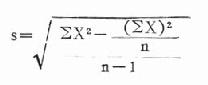 以上是总体方差和标准差。实际工作中经常得到的是样本资料,μ是未知的,只能用样本均数x来代替μ,用样本含量n代替N,按公式(18.11)算得的标准差常比σ小,美国统计学家W.S.Gosset提出用n-1代替n,求得样本标准差s,即