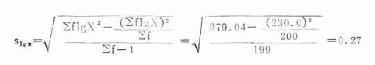 该资料为偏态分布,经对数变换(即原始数据取对数)后,整理成频数表,见表18-5。从频数分布看,近似正态分布,计算对数形式的均数与标准差,得: xlgx=Σflgx/Σf=230.0/200=1.15