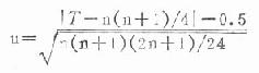 (一)建立假设 H0:宇航对心率无影响,即差值的总体中位数M=0 H1:宇航对心率有影响,即差值的总体中位数M≠0 α=0.05 (二)求各对数值的差数如表21-2第(4)栏 (三)编秩按差值的绝对值由小到大编秩,将秩次按差值的正负分两栏,如表21-2第(5)、(6)栏。注意:编秩时,遇有几个绝对值相等、符号相反的差值时,各取平均秩次;符号相同的相等差数,可不必取平均秩次;遇有差值为0的,则弃去不计,随之从相应的对子数n中减去。 (四)确定统计量t 分别求正负秩次之和,以绝对值较小者为统计量T,如表21-2第(5)、(6)两栏的合计。本例T=7。 (五)确定P值,作出推论 1.查表法用于对子数n≤25时,根据对子数n查附表21-1符号秩和检验临界值表。若现有统计量T值大于表中相应的界值T0.05,则P>0.05;若现有统计量小于或等于表中相应的T0.05,则P≤0.05。本例对子数n=12,查表得T0.01=7,本例T=7,故P=0.01,按α=0.05检验水准拒绝H0,可认为宇航对心率有影响,使心率增快。由此看出符号秩和检验比符号检验效率高。 2.正态近似法对子数n>25时,按式(21.2)计算统计u值。