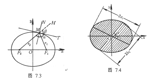 切线把点M的两焦点半径间的外角(即∠F1MH)平分(a =b ,),M点的法线MN把内角(即∠F1MF2)平分(图7.3)