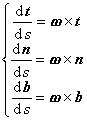 把活动标架看作一个刚体,就是当M沿曲线移动时,M的活动标架好象刚体那样绕M转动.这时把s看作时间,则根据运动学的原理可以得出活动标架的瞬时转动速度的表达式为