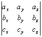 [三个矢量的混合积]  a(ax,ay,az)b(bx,by,bz)c(cx,cy,cz)为三个矢量,则它们的混合积定义为