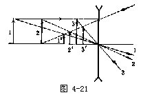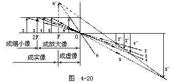 【球面镜成像】 对于凸面镜只能使特成正立、缩小的虚像。如图4-2(a)所示。由物A点出发的平行于光轴的光线,达到镜面后将反射,其反射光的延长线必交球面镜的焦点F上。而从A射向F的光线被球面反射后将平行于光轴。这两条反射线,没有实交点,只有虚交点A′,也就是说视觉认为这两条光线是从A′发出的。物体上的B点发出的沿光轴的光线,即平行于光轴,又过焦点,故B′为B点的像。在物体AB上的各点,接照前述办法作图,其各点的像点都在A′B′上,故A′B′即为AB的像。无论物AB在何处,它所发出的光射到球面镜后而反射的光,没有实交点,因此所成之像必为虚像。由图中可以看出,物体在轴的上方,所成的虚像也在轴的上方,故所成之像为正立。无论AB在什么位置,从A点出发的平行于轴的光线一定在AF方向的光线的上方。此两线的交点A′必比A点更靠近轴,所以像是缩小的。根据上述方法作图可知凹透镜成像可有三种情况:(1)物在凹镜前二倍焦距以外时,是倒立缩小的实像,见图4-2(b)。(2)物在两倍焦距以内,焦点以外时,则成倒立放大的实像,见图4-2(c)。(3)当物位于焦点以内时,则成正立的放大的虚像,见图4-2(c)。