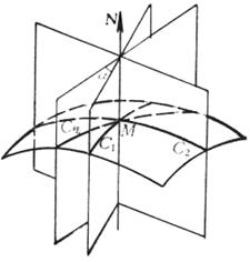 Suppose the intersection line of the approximation surface of a point M on any curve B on the surface with the surface is C , then the radius of curvature of the surface B is equal to the radius of curvature of the sectional line C , so from the formula ( 1 ), we get Meniere's theorem: any curve B on the surface The radius of curvature of is equal to the orthographic projection of the radius of curvature of the corresponding normal section intercepted on the surface normal on the principal normal of curve B.![]()