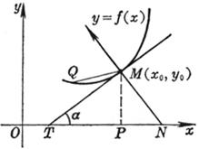 [ The tangent and normal of the curve ] When the point Q on the curve tends to M , the limit position of the secant MQ is called the tangent of the curve at the point M , and the straight line passing through the point M and perpendicular to the tangent is called the normal . The tangent The positive direction of the tangent is the positive direction of the curve at the tangent point, and the positive direction of the normal is the direction obtained by rotating the positive direction of the tangent by 90 ° counterclockwise .