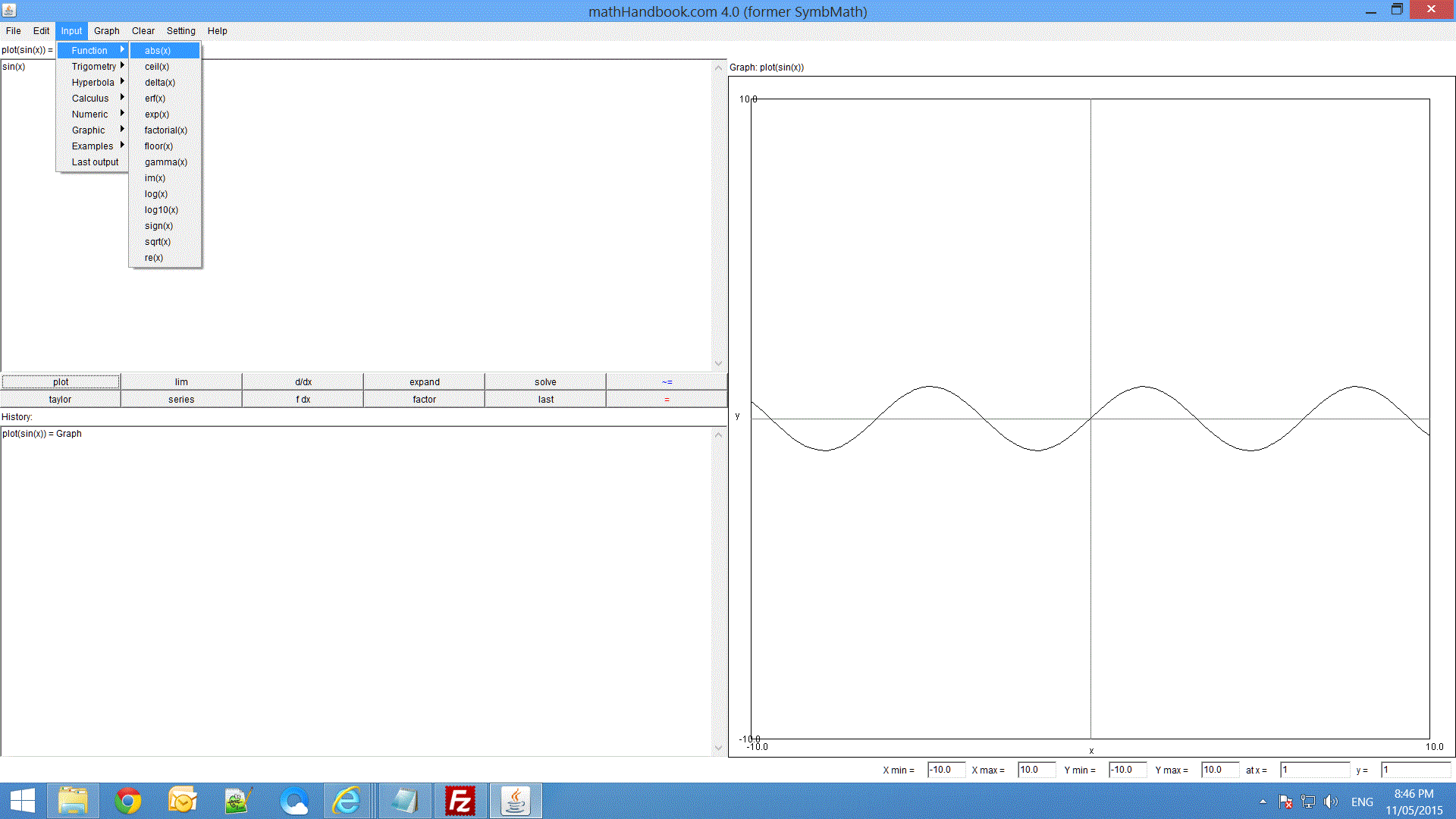| numeric limit `lim _(x->0) sin(x)/x` | |